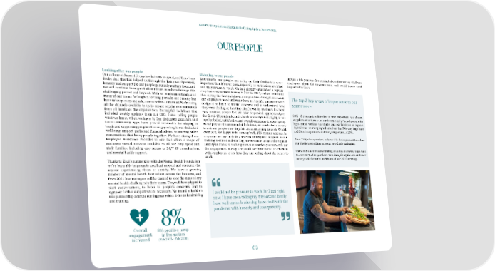 Azzurri Group Limited Sustainable Dining Update Report 2021 OUR PEOPLE Looking after our people Listening to our people In March this year we also conducted our �irst survey of all our Our culture at Azzurri Group is what sets us apart, and there’s no employees about the environmental and social issues most Listening to our people and acting on their feedback is more doubt that this has helped us through the last year. Openness, important than it’s ever been, especially as restrictions are lifted important to them. honesty and respect for our people genuinely matters to us, and and they return to work. We had already established a regular we will continue to support all our team members through this employee engagement survey in Zizzi in 2019, and we continued challenging period and beyond. With so much uncertainty and this during the �irst lockdown, giving us lots of insight into what The top 3 key areas of importance to our many of our teams furloughed for long periods, our priority has our employees need and want from us. Speci�ic questions were been to keep everyone safe, connected and informed. We’re using designed to listen to teams’ concerns and to understand how teams were: all the channels available to us to ensure regular communication they were feeling at this time. On the whole, feedback has been from all levels of the organisation. During full lockdown this very positive; people feel we have responded appropriately to 60% of responders felt that it was important we choose included weekly updates from our CEO, Steve, telling people the Covid-19 pandemic, and it has been really encouraging to see suppliers who farm in an environmentally friendly way, with what we knew, when we knew it. Our dedicated Zizzi, ASK and loyalty, belief, satisfaction and overall engagement scores go up. Coco community apps have proved invaluable for staying in As we prepared to come out of lockdown, we conducted a survey high animal welfare standards, and use fairtrade or organic ingredients - sourcing ingredients from the UK is very important touch and supporting people – from signposting to our dedicated to ask our people how they felt about returning to work. Whilst to 35% of responders and fairly important to 28%. wellbeing support packs and �inancial advice, to starting online over 50% are happy to be coming back, 15% remain anxious. In conversations that bring people together. We have changed our response we are including sources of help and support in our Over 75% of responders believe it to be important to reduce Employee Assistance Provider to one that offers a range of training sessions and starting conversations around the signs of extensive virtual services available to all our employees and anxiety and how to seek support. Our aim this year is to roll out our plastic use and increase our recyclable packaging. their families, including easy access to 24/7 GP consultations, the engagement survey across all our brands and to check in The safety and mental well being of our teams is very important and mental health support. with employees to see how they are feeling about the return to to over 60% of responders. This data, alongside our customer work. Thanks to Zizzi’s partnership with the Mental Health Foundation, survey, will form the backbone of our 2025 strategy. we’ve been able to promote excellent support and resources for anyone experiencing stress or anxiety. We have a growing number of mental health �irst aiders across the business, and from 2021 line managers will be trained to spot the signs of any mental health challenges in their teams. They will be equipped to start conversations, to listen to people’s concerns, and to signpost further support where necessary. We intend to build on this partnership over the coming year with a focus on fundraising I could not be prouder to work for Zizzi right now. I have been telling my friends and family and training. how well senior leadership have dealt with the 8% pandemic with honesty and transparency. Overall 8% positive jump engagement in Promoters increased (Feb 2019 – Feb 2020) 03