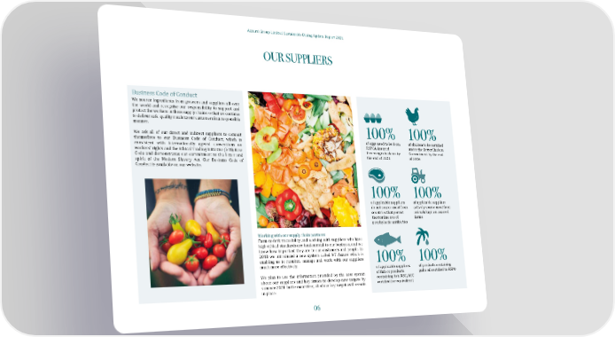 Azzurri Group Limited Sustainable Dining Update Report 2021 OUR SUPPLIERS Business Code of Conduct We source ingredients from growers and suppliers all over the world and recognise our responsibility to support and protect the workers in those supply chains so that we continue to deliver safe, quality meals to our customers in a responsible manner. 100% 100% We ask all of our direct and indirect suppliers to commit themselves to our Business Code of Conduct, which is of eggs used to be from of chicken to be certi�ied consistent with internationally agreed conventions on RSPCA Assured under the BetterChicken workers’ rights and the Ethical Trading Initiative (ETI) Base free-range chickens by Commitment by the end Code and demonstrates our commitment to the letter and the end of 2021 of 2026 spirit of the Modern Slavery Act. Our Business Code of Conduct is available on our website. 100% 100% of applicable suppliers of applicable suppliers do not source meat from actively source meat from countries that permit animals kept on assured the routine use of farms prophylactic antibiotics Working with our supply chain partners Farm-to-fork traceability and working with suppliers who have high ethical standards are fundamental to our business, and we know how important they are to our customers and people. In 2018 we introduced a new system called NT Assure which is enabling us to monitor, manage and work with our suppliers 100% 100% much more effectively. of applicable suppliers of products containing of �ish or products palm oil certi�ied to RSPO We plan to use the information provided by the new system containing �ish MSC/ASC about our suppliers and key issues to develop new targets by certi�ied (or equivalent) summer 2021. In the meantime, all of our key targets will remain in place: 06