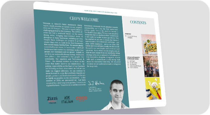 Azzurri Group Limited Sustainable Dining Update Report 2021 CEO’S WELCOME CONTENTS Welcome to Azzurri’s latest sustainable dining investment community for it’s attention towards report, which provides an update on our progress sustainability, as it was the �irst mainstream since our 2018 report. This year’s report follows a private equity �irm in the world to become a OVERVIEW challenging period for the business. The COVID-19 Certi�ied B Corporation. ("B Corp" is an award for 01 Sustainable dining crisis has had a profound impact on the casual companies that are leaders in their commitment at Azzurri dining sector, bringing unprecedented levels of to ESG and responsible business practices). This disruption to many businesses, including our own. has enabled us not only to secure the future of Despite these challenges our purpose is perhaps approximately 225 restaurants and shops - and clearer than ever, to build better food businesses some 5,000 employees - across our Zizzi, ASK that sustain happy, healthy lives. We remain deeply Italian and Coco di Mama brands, but also to look committed to our vision, to ‘serve better’ with food forward to our next chapter with excitement and businesses that nourish the individual needs of our optimism. As we re�lect on our progress and all people, our customers and our planet. Indeed, as that we have learned from our sustainable dining we do to our sustainable dining strategy. Built upon strategy so far, we are pleased to be building on a �ive pillars – Our customers, Our people, Our �irm foundation alongside a long-term investor 5 PILLAR APPROACH TO community, Our suppliers and Environment & with such a commitment to and strong track SUSTAINABLE DINING 03 Our People Planet - the strategy enables us to focus on the record in responsible ownership. We are proud 05 Our Customers issues that matter most to our stakeholders. By of where we are and look forward to seeing how 06 Our Suppliers 07 Environment & Planet putting responsibility at the heart of our business far we go next. 09 Our Community and focusing on those areas where we feel we can make the biggest difference, we can continue to move forward in a way that positively impacts our people, partners and local communities, and treads as lightly as possible on the environment. In the summer of 2020, we announced we had been acquired by a new long term partner, TowerBrook Capital Partners. TowerBrook is well known in the Steve Holmes Chief Executive Of�icer Azzurri Central Limited