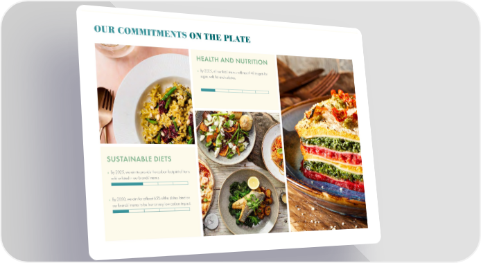 OUR COMMITMENTS ON THE PLATE HEALTH AND NUTRITION » By 2025, all our kids’ menus will meet PHE targets for sugar, salt, fat and calories. SUSTAINABLE DIETS » By 2025, we aim to provide the carbon footprint of items sold or listed in our brands’ menus. » By 2030, we aim for at least 65% of the dishes listed on our brands’ menus to be low or very low carbon impact.