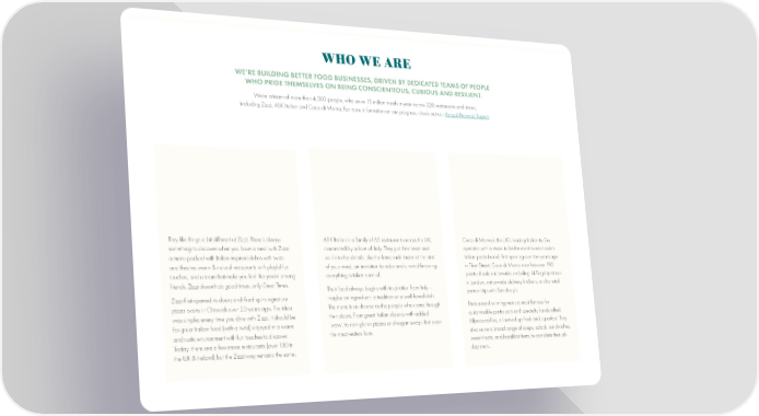 WHO WE ARE WE’RE BUILDING BETTER FOOD BUSINESSES, DRIVEN BY DEDICATED TEAMS OF PEOPLE WHO PRIDE THEMSELVES ON BEING CONSCIENTIOUS, CURIOUS AND RESILIENT. We’re a team of more than 4,500 people, who serve 15 million meals a year across 220 restaurants and stores, including Zizzi, ASK Italian and Coco di Mama. For more information on our progress, check out our Annual Financial Report. They like things a bit different at Zizzi. There’s always ASK Italian is a family of 65 restaurants across the UK, Coco di Mama is the UK’s leading Italian-to-Go something to discover when you have a meal with Zizzi: connected by a love of Italy. They put their heart and operator with a vision to be the most-loved modern a menu packed with Italian-inspired dishes with twists soul into the details. Like the lemonade taster at the start Italian pasta brand. First opening over ten years ago and theatre, warm & natural restaurants with playful fun of your meal, an invitation to relax and unwind knowing in Fleet Street, Coco di Mama now has over 190 touches, and a team that make you feel like you’re among everything is taken care of. points of sale nationwide, including 14 昀氀agship stores friends. Zizzi doesn’t do good times, only Great Times. Their food always begins with inspiration from Italy – in London, nationwide delivery kitchens, and a retail Zizzi 昀椀rst opened its doors and 昀椀red up its signature maybe an ingredient, a tradition or a well-loved dish. partnership with Sainsbury’s. pizza ovens in Chiswick over 20 years ago. The idea The menu is as diverse as the people who come through Their award-winning menu is most famous for was simple: every time you dine with Zizzi, it should be their doors. From great Italian classics with added customisable pasta pots and specialty handcrafted for great Italian food (with a twist) enjoyed in a warm ‘wow’, to non-gluten pizzas and vegan swaps that even Allpress coffee, all served up fresh and superfast. They and rustic environment with fun touches to discover. the meat-eaters love. also serve a broad range of soups, salads, sandwiches, Today, there are a few more restaurants (over 130 in sweet treats, and breakfast items to complete their all- the UK & Ireland) but the Zizzi way remains the same. day menu.