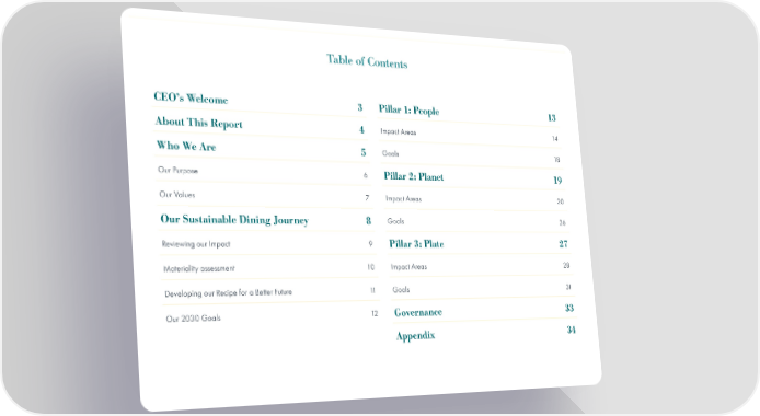 Table of Contents CEO’s Welcome 3 Pillar 1: People 13 About This Report 4 Impact Areas 14 Who We Are 5 Goals 18 Our Purpose 6 Pillar 2: Planet 19 Our Values 7 Impact Areas 20 Our Sustainable Dining Journey 8 Goals 26 Reviewing our Impact 9 Pillar 3: Plate 27 Materiality assessment 10 Impact Areas 28 Developing our Recipe for a Better Future 11 Goals 31 Our 2030 Goals 12 Governance 33 Appendix 34