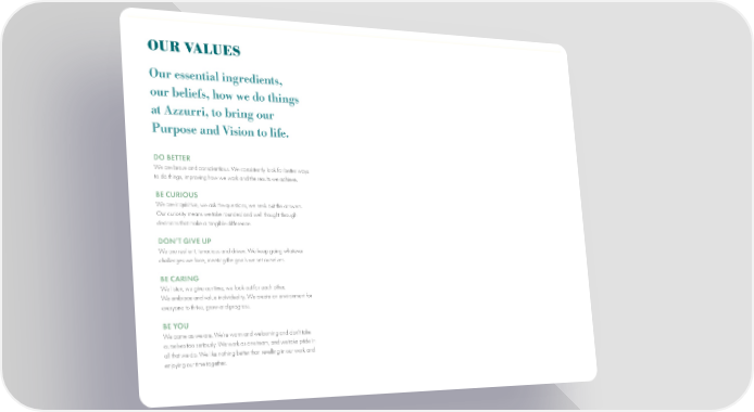 OUR VALUES Our essential ingredients, our beliefs, how we do things at Azzurri, to bring our Purpose and Vision to life. DO BETTER We are brave and conscientious. We consistently look for better ways to do things, improving how we work and the results we achieve. BE CURIOUS We are inquisitive, we ask the questions, we seek out the answers. Our curiosity means we take rounded and well thought through decisions that make a tangible difference. DON’T GIVE UP We are resilient, tenacious and driven. We keep going whatever challenges we face, meeting the goals we set ourselves. BE CARING We listen, we give our time, we look out for each other. We embrace and value individuality. We create an environment for everyone to thrive, grow and progress. BE YOU We come as we are. We’re warm and welcoming and don’t take ourselves too seriously. We work as one team, and we take pride in all that we do. We like nothing better than revelling in our work and enjoying our time together.