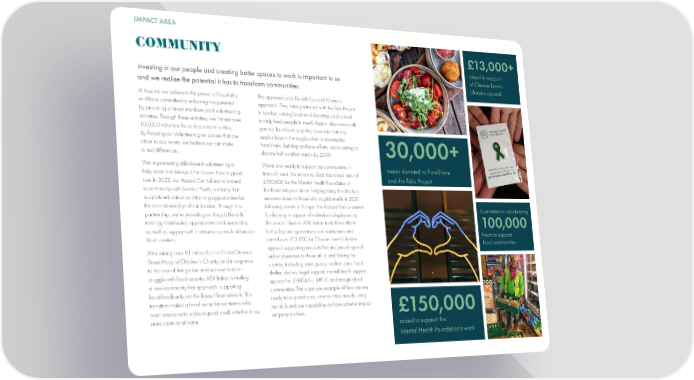 IMPACT AREA COMMUNITY £13,000+ raised in support Investing in our people and creating better spaces to work is important to us of Choose Love’s and we realise the potential it has to transform communities. Ukraine appeal At Azzurri, we believe in the power of hospitality This approach also 昀椀ts with Coco di Mama’s and have committed to unlocking this potential approach. They have partnered with the Felix Project by providing all team members paid volunteering in London, raising funds and donating surplus food activities. Through these activities, we’ll invest over to help feed people in need. Azzurri also works with 100,000 volunteer hours in our communities. partner, Best Food Logistics, to ensure that any By focusing our volunteering on causes that are surplus food in the supply chain is donated to close to our hearts, we believe we can make FareShare. Building on these efforts, we’re aiming to 30,000+ a real difference. donate half a million meals by 2030. We’re promoting skills-based volunteering to We’re also ready to support our communities in meals donated to FareShare help team members put their know-how to good times of need. For instance, Zizzi has raised around and the Felix Project use. In 2022, our Azzurri Central teams formed £150,000 for the Mental Health Foundation in a partnership with London Youth, a charity that this 昀椀nancial year alone, helping bring the charity’s supports education and training opportunities for services closer to those who might bene昀椀t. In 2021 the most at-need youths in London. Through this following events in Europe, the Azzurri Group started Committed to volunteering partnership, we’re providing on the job life skills fundraising in support of individuals displaced by training, shadowing opportunities and mentorship, the war in Ukraine. ASK Italian took these efforts 100,000 as well as support with maintenance work at London further by raising awareness in restaurants and hours to support Youth centres. raised over £13,000 for Choose Love’s Ukraine local communities After raising over £1 million for the Great Ormond appeal, supporting projects that are providing vital Street Hospital Children’s Charity, and in response aid and services to those still in and 昀氀eeing the to the cost of living crisis and our communities’ country, including: emergency medical care, food, struggle with food security, ASK Italian is trialling shelter, clothes, legal support, mental health support, a new community 昀椀rst approach, supporting support for LGBTQIA+, BIPOC and marginalised local foodbanks via the Trussell Trust network. This communities. This is just one example of how we are transition makes a lot of sense for our teams who ready to respond to our communities’ needs, using want everyone to enjoy a good meal, whether in our our skills and our capabilities to have a better impact restaurants or at home. on people’s lives. £150,000 raised to support the Mental Health Foundation’s work