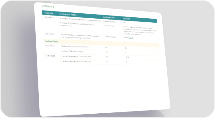 APPENDIX 2 SASB CODE ACCOUNTING METRIC MATERIAL TOPICS RESPONSE FB-RN-430a.2 Percentage of (1) eggs that originated from a cage-free environment Sustainable Sourcing 100% Percentage of (2) pork that was produced without the use Sustainable Sourcing 43% of our main products come from gestation crate-free of gestation crates environments, 57% of our main pork products come from limited- gestation crate environments (compliant with local legislation and/or Red Tractor certi昀椀cations) FB-RN-430a.3 Discussion of strategy to manage environmental and social risks Sustainable Sourcing Refer to page 30 within the supply chain, including animal welfare Activity Metric FB-RN-000.A Number of (1) company-owned restaurants NA 214 Number of (2) franchise restaurants NA 0 FB-RN-000.B Number of employees at (1) company-owned NA 4500 Number of employees at (2) franchise locations NA 0