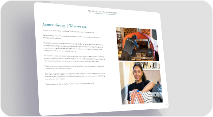 Azzurri Group Gender Pay Gap Report 2023 Azzurri Group | Who we are At Azzurri, our purpose is simple: to build better food businesses that sustain happy, healthy lives. The Group employs over 5,600 people across an estate of over 200 restaurants and stores, including Zizzi, ASK Italian and Coco di Mama. We’re here to create food businesses that are as unique and individual as the people that work in them, and we are committed to providing an engaging, inspiring, honest and open environment for our teams. We do that by supporting our team members to develop and grow with our businesses , investing in their well-being, and by creating opportunities for those who might want to join us. We empower our teams, with training, development and career opportunities that create con昀椀dence, support long- term growth and allow individuals to thrive. Our values are at our core, and we are proud that across the Group we have people that care deeply, look out for each other and work together to be the best that they can be. Through our bi-annual engagement surveys, listening groups and one to ones, we learn what is important to all our team members and where we can improve. Reporting on our gender pay gap on an annual basis makes us challenge ourselves and agree actions that will drive meaningful change. We are proud of the work we have already done, and we are committed to driving more action over the coming year. This report outlines our Gender Pay Gap for 2023, using a snapshot date in April 2023. 2