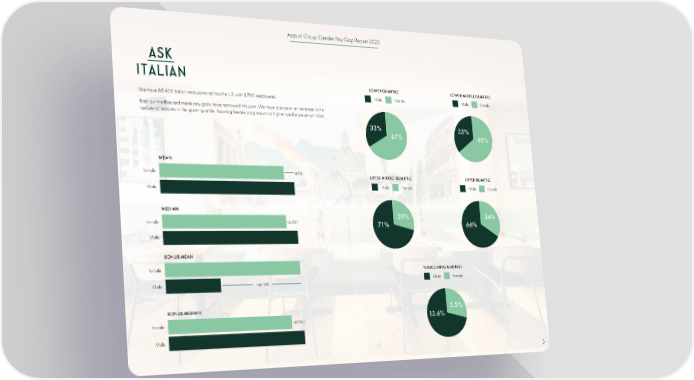 Azzurri Group Gender Pay Gap Report 2023 LOWER QUARTILE LOWER MIDDLE QUARTILE We have 65 ASK Italian restaurants across the UK with 1,700 employees. Male Female Male Female Both our median and mean pay gaps have narrowed this year. We have also seen an increase in the number of females in the upper quartile, showing female progression to higher paid more senior roles. 33% 35% 67% 65% MEAN Female 4.0% UPPER MIDDLE QUARTILE UPPER QUARTILE Male Male Female Male Female MEDIAN 29% 34% Female 4.4% 71% 66% Male BONUS MEAN Female % RECEIVING A BONUS Male Female Male −43.6% BONUS MEDIAN 5.5% Female 4.9% 13.6% Male 5