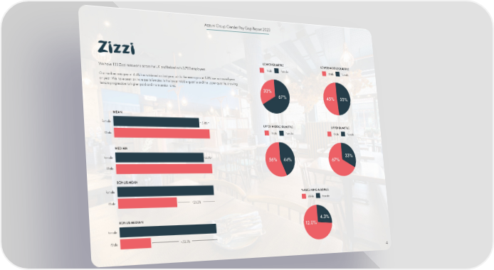 Azzurri Group Gender Pay Gap Report 2023 LOWER QUARTILE LOWER MIDDLE QUARTILE We have 133 Zizzi restaurants across the UK and Ireland with 3,700 employees. Male Female Male Female Our median pay gap at 4.4% has widened on last year, whilst the mean gap at 5.8% has narrowed year on year. We have seen an increase in females in the lower middle quartile and the upper quartile, showing female progression to higher paid and more senior roles. 33% 67% 45% 55% MEAN Female 5.8% UPPER MIDDLE QUARTILE UPPER QUARTILE Male Male Female Male Female MEDIAN Female 4.4% 56% 44% 67% 33% Male BONUS MEAN Female % RECEIVING A BONUS Male Female Male −25.2% BONUS MEDIAN 4.3% Female 12.0% Male −53.2% 4
