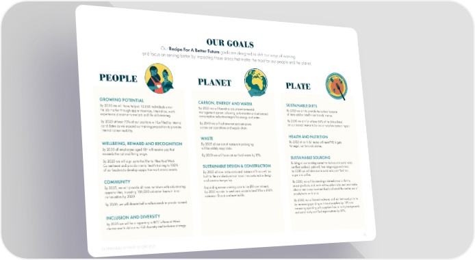 OUR GOALS Our Recipe For A Better Future goals are designed to shift our ways of working and focus on serving better by impacting those areas that matter the most for our people and the planet. PEOPLE PLANET PLATE GROWING POTENTIAL CARBON, ENERGY AND WATER SUSTAINABLE DIETS By 2030 we will have helped 10,000 individuals enter By 2025 we will launch a robust environmental By 2025 we aim to provide the carbon footprint the job market through apprenticeships, internships, work management system, allowing us to monitor and set annual of items sold or listed in our brands’ menus. experience placements and job and life skills training. consumption reduction targets for energy and water. By 2030 we aim for at least 65% of the dishes listed By 2025 at least 70% of our positions will be 昀椀lled by internal By 2040 we will achieve net zero emissions on our brands’ menus to be low or very low carbon impact. candidates as we expand our training proposition to promote across our operations and supply chain. internal career mobility. WASTE HEALTH AND NUTRITION WELLBEING, REWARD AND RECOGNITION By 2025 all our out of restaurant packaging By 2025 all our kids’ menus will meet PHE targets will be widely recyclable. for sugar, salt fat and calories. By 2030 all employyes aged 18+ will receive pay that exceeds the national living wage. By 2030 we will have cut our food waste by 15%. By 2025 we will sign up to the Mental Health at Work SUSTAINABLE SOURCING Commitment and provide mental health training to 100% SUSTAINABLE DESIGN & CONSTRUCTION Building on our existing commitments to source sustainably of our leaders to develop supportive work environments. certi昀椀ed seafood, palm oil, free-range eggs and meat, By 2025 all new restaurants and restaurant 昀椀t-outs will be by 2030 we will also source sustainably certi昀椀ed rice, built to the standards set out in our new sustainable design sugar and coffee. COMMUNITY and construction policy. By 2030, we will be sourcing sustainably our uniforms, By 2025, we will provide all team members with volunteering Expanding on our existing zero-to-land昀椀ll commitment, paper products, and work with suppliers who use sustainable opportunities, investing 100,000 volunteer hours in local by 2025 we aim to send zero waste to land昀椀ll from 100% alternatives to soy in animal feed and avoid the routine use of communities by 2030 restaurant 昀椀t outs and new builds. prophylactic antibiotics. By 2030, we will donate half a million meals to people in need By 2030, we will invest in diverse and resilient supply chains by increasing spending with local suppliers by 10% and INCLUSION AND DIVERSITY increasing spending with suppliers from minority backgrounds and sustainably certi昀椀ed organisations by 20%. By 2025 we will be a signatory to BITC’s Race at Work charter and build out our full diversity and inclusion strategy. SUSTAINABLE DINING REPORT 2023 10