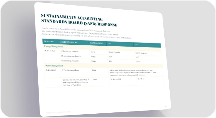 SUSTAINABILITY ACCOUNTING STANDARDS BOARD (SASB) RESPONSE This disclosure marks Azzurri Group’s 昀椀rst response to the SASB Restaurants Standard. We are in the process of developing our approach to collecting data for the accounting metrics. For metrics for which data is not yet available, we offer information on our approach to and targets for these topics. SASB CODE ACCOUNTING METRIC MATERIAL TOPICS 2022 2023 Energy Management FB-RN-130a.1 (1) Total energy consumed Energy 198,622 Gigajoules 225,185 Gigajoules (2) percentage grid electricity Energy 100% 100% (3) percentage renewable Energy 3.3% 12.3% Water Management FB-RN-140a.1 (1) Total water withdrawn Water Data for water withdrawal and consuption is not yet centralised at entity level. We are taking action to improve our data collection processes in order to accurately measure water consumption and are committed to reducing it. (2) total water consumed, percentage of Water No data available 20,3414 m3 each in regions with High or Extremely High Baseline Water Stress SUSTAINABLE DINING REPORT 2023 46