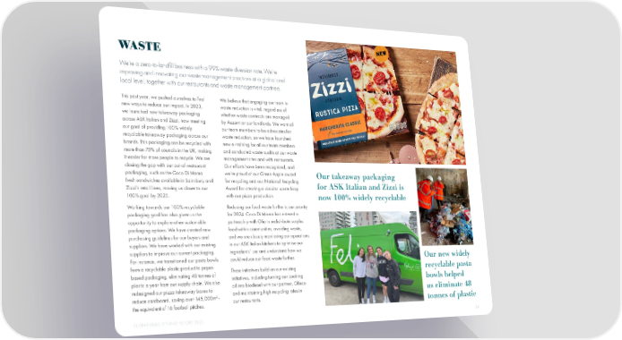 WASTE We’re a zero-to-land昀椀ll business with a 99% waste diversion rate. We’re improving and innovating our waste management practices at a global and local level, together with our restaurants and waste management partners. This past year, we pushed ourselves to 昀椀nd We believe that engaging our team in new ways to reduce our impact. In 2023, waste reduction is vital, regardless of we launched new takeaway packaging whether waste contracts are managed across ASK Italian and Zizzi, now meeting by Azzurri or our landlords. We want all our goal of providing 100% widely our team members to be advocates for recyclable takeaway packaging across our waste reduction, so we have launched brands. This packaging can be recycled with new e-training for all our team members more than 75% of councils in the UK, making and conducted waste audits at our waste it easier for more people to recycle. We are management sites and with restaurants. closing the gap with our out-of-restaurant Our efforts have been recognised, and packaging, such as the Coco Di Mama we’re proud of our Green Apple award Our takeaway packaging fresh sandwiches available in Sainsbury and for recycling and our National Recycling for ASK Italian and Zizzi is Zizzi’s retail lines, moving us closer to our Award for creating a circular waste loop 100% goal by 2025. with our pizza production. now 100% widely recyclable Working towards our 100% recyclable Reducing our food waste further is our priority packaging goal has also given us the for 2024. Coco Di Mama has entered a opportunity to explore other sustainable partnership with Olio to redistribute surplus packaging options. We have created new food within communities, avoiding waste, purchasing guidelines for our buyers and and we are closely monitoring our operations suppliers. We have worked with our existing in our ASK Italian kitchens to optimise our suppliers to improve our current packaging. ingredients’ use and understand how we For instance, we transitioned our pasta bowls could reduce our food waste further. Our new widely from a recyclable plastic product to paper- These initiatives build on our existing recyclable pasta based packaging, eliminating 48 tonnes of initiatives, including turning our cooking plastic a year from our supply chain. We also oil into biodiesel with our partner, Olleco bowls helped redesigned our pizza takeaway boxes to and maintaining high recycling rates in us eliminate 48 reduce cardboard, saving over 145,000m2 - the equivalent of 16 football pitches. our restaurants. tonnes of plastic SUSTAINABLE DINING REPORT 2023 24