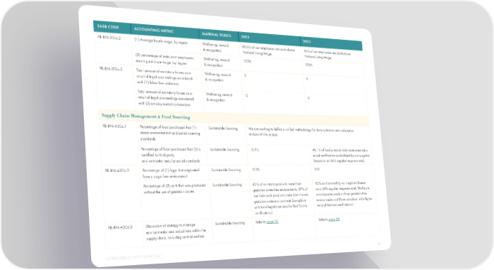 SASB CODE ACCOUNTING METRIC MATERIAL TOPICS 2022 2023 FB-RN-310a.2 (1) Average hourly wage, by region Wellbeing, reward 80.3% of our employees are paid above 86% of our employees are paid above & recognition National Living Wage. National Living Wage. (2) percentage of restaurant employees Wellbeing, reward 100% 100% earning minimum wage, by region & recognition FB-RN-310a.3 Total amount of monetary losses as a Wellbeing, reward 0 0 result of legal proceedings associated & recognition with (1) labor law violations Total amount of monetary losses as a Wellbeing, reward 0 0 result of legal proceedings associated & recognition with (2) employment discrimination Supply Chain Management & Food Sourcing FB-RN-430a.1 Percentage of food purchased that (1) Sustainable Sourcing We are working to de昀椀ne a uni昀椀ed methodology for data collection and calculation meets environmental and social sourcing at Azzurri Group level standards Percentage of food purchased that (2) is Sustainable Sourcing 15.9% 48.1% of food products hold environmental or certi昀椀ed to third-party social certi昀椀cation as disclosed by our suppliers environmental and/or social standards (based on an 86% supplier response rate). FB-RN-430a.2 Percentage of (1) eggs that originated Sustainable Sourcing 100% 100 from a cage-free environment Percentage of (2) pork that was produced Sustainable Sourcing 43% of our main products come from 83% as disclosed by our suppliers (based without the use of gestation crates gestation crate-free environments, 57% of on a 60% supplier response rate). This 昀椀gure our main pork products come from limited- encompasses products from gestation-free gestation crate environments (compliant environments and those compliant with Higher with local legislation and/or Red Tractor Animal Welfare certi昀椀cations) certi昀椀cations) FB-RN-430a.3 Discussion of strategy to manage Sustainable Sourcing Refer to page 30 Refer to page 38 environmental and social risks within the supply chain, including animal welfare SUSTAINABLE DINING REPORT 2023 49
