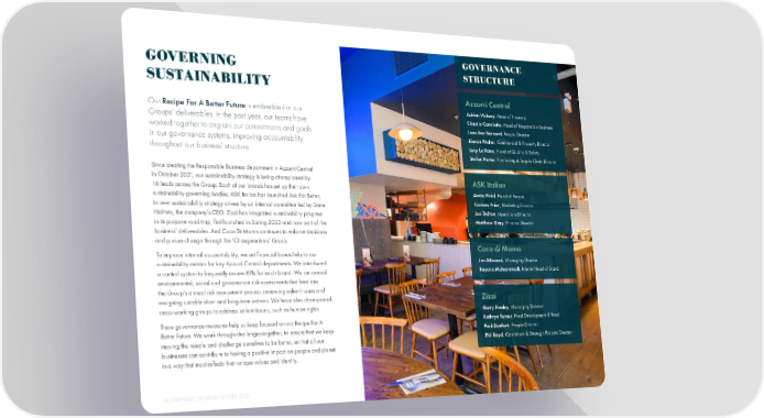 GOVERNING GOVERNANCE STRUCTURE SUSTAINABILITY Azzurri Central Our Recipe For A Better Future is embedded in our Adrian Vickery, Head of Property Groups’ deliverables. In the past year, our teams have Claudia Candiotto, Head of Responsible Business worked together to engrain our commitments and goals Jane Bon Bernard, People Director in our governance systems, improving accountability Kieran Pitcher, Commercial & Property Director throughout our business’ structure. Lucy La Rana, Head of Quality & Safety Stefan Porter, Purchasing & Supply Chain Director Since creating the Responsible Business department in Azzurri Central in October 2021, our sustainability strategy is being championed by ASK Italian 16 leads across the Group. Each of our brands has set up their own Amita Patel, Head of People sustainability governing bodies. ASK Italian has launched Ask For Better, its own sustainability strategy driven by an internal committee led by Steve Corinne Prior, Marketing Director Holmes, the company’s CEO. Zizzi has integrated sustainability progress Jan Dalton, Operations Director in its purpose roadmap, 昀椀rst launched in Spring 2023 and now part of the Matthew Gray, Finance Director business’ deliverables. And Coco Di Mama continues to enforce decisions and pursue change through the ‘Changemakers’ Group. To improve internal accountability, we set 昀椀nancial bonus links to our Coco di Mama sustainability metrics for key Azzurri Central departments. We introduced Jim Attwood, Managing Director a control system to frequently review KPIs for each brand. We run annual Keyana Mohammadi, Interim Head of Brand environmental, social and governance risk assessments that feed into the Group’s annual risk assessment process reviewing salient issues and assigning suitable short and long-term actions. We have also championed Zizzi cross-working groups to address salient issues, such as human rights. Harry Heeley, Managing Director These governance measures help us keep focused on our Recipe For A Kathryn Turner, Food Development & Food Better Future. We work through challenges together, to ensure that we keep Paul Dunford, People Director moving the needle and challenge ourselves to be better, so that all our Phil Boyd, Operations & Strategic Projects Director businesses can contribute to having a positive impact on people and planet in a way that most re昀氀ects their unique values and identity. SUSTAINABLE DINING REPORT 2023 11