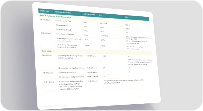 SASB CODE ACCOUNTING METRIC MATERIAL TOPICS 2022 2023 Food & Packaging Waste Management FB-RN-150a.1 (1) Total amount of waste Waste 5,856.51 Mt 6,224 Mt (2) percentage food waste Waste 7.58% 13.95% (3) percentage diverted Waste 99.7% 99% FB-RN-150a.2 (1) Total weight of packaging Waste 1,724.09 Mt 640.44 Mt (based on EPR reporting standards for calendar year 2023) (2) percentage made from recycled and/ Waste 30.7% We are working with suppliers to improve or renewable materials the accurary of this 昀椀gure. (3) percentage that is recyclable, Waste 50.7% 88%. This includes our retail and reusable, and/or compostable takeaway business lines. Food safety FB-RN-250.a1 (1) Percentage of restaurants inspected by a Health & Nutrition 44.9% 45% food safety oversight body 100% of our restaurants and stores are subjects to two annual third-party inspections as part of our comprehensive audit programme. (2) percentage receiving critical violations Health & Nutrition 0% 0% FB-RN-250.a2 (1) Number of recalls issued Health & Nutrition 0 0 (2) total amount of food product recalled Health & Nutrition 0 0 FB-RN-250a.3 Number of con昀椀rmed foodborne illness Health & Nutrition Not applicable. This metric is only relevant to operations in the United States, outbreaks, percentage resulting in which Azzurri does not have. U.S. Centers for Disease Control and Prevention (CDC) investigation SUSTAINABLE DINING REPORT 2023 47