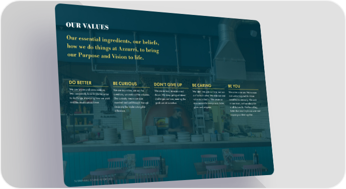 OUR VALUES Our essential ingredients, our beliefs, how we do things at Azzurri, to bring our Purpose and Vision to life. DO BETTER BE CURIOUS DON’T GIVE UP BE CARING BE YOU We are brave and conscientious. We are inquisitive, we ask the We are resilient, tenacious and We listen, we give our time, we look We come as we are. We’re warm We consistently look for better ways questions, we seek out the answers. driven. We keep going whatever out for each other. We embrace and and welcoming and don’t take to do things, improving how we work Our curiosity means we take challenges we face, meeting the value individuality. We create an ourselves too seriously. We work and the results we achieve. rounded and well thought through goals we set ourselves. environment for everyone to thrive, as one team, and we take pride decisions that make a tangible grow and progress. in all that we do. We like nothing difference. better than revelling in our work and enjoying our time together. SUSTAINABLE DINING REPORT 2023 7