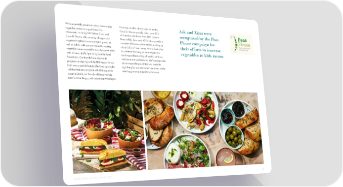 We’re especially passionate about encouraging For those mindful of their calorie intake, Ask and Zizzi were vegetable intake among children. Our Coco Di Mama proudly offers over 90% recognised by the Peas restaurants, including ASK Italian, Zizzi, and of its mains with fewer than 800 calories. Coco Di Mama, offer an array of vegan and Meanwhile, Zizzi and ASK Italian provide a Please campaign for vegetarian options for our youngest guests, as selection of lower-calorie dishes, making up their efforts to increase well as adults, with our commitment to making about 35% of their menus. We’re dedicated vegetables more accessible recently commended to continual learning as we navigate the vegetables in kids menus with a Green-Traf昀椀c light rating from the Food evolving understanding of health, wellness, Foundation. Our brands have also made and consumer preferences. We’re passionate progress on aligning with the PHE targets for our about expanding our initiatives to do the kids’ menus and all brands offer food options for right thing for our consumer’s nutrition, whilst children that are compliant with PHE targets for meeting growing regulatory demands. sugar. In 2024, our brands will keep working hard to close the gap with remaining PHE targets. SUSTAINABLE DINING REPORT 2023 35