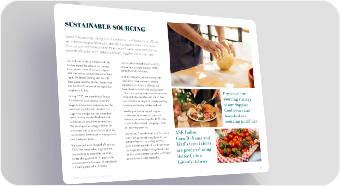 SUSTAINABLE SOURCING Sustainable sourcing is a big part of our Recipe For A Better Future. We’ve set ambitious targets that need a joint effort across the entire value chain. From the food we serve to the uniforms our staff wear, we’re on a journey towards a brighter, more sustainable future, together with our partners. Our customers hold us to high standards sustainability certi昀椀cation such as RSPO, and we expect the same of our partners. and we’re working to maintain 100% Our Business Code of Conduct, aligned compliance with this target. with international conventions on workers’ In other categories, we are working with rights, the Ethical Trading Initiative (ETI) suppliers to move to more sustainable Base Code, and the Modern Slavery Act, ingredients. For instance, although we sets the ethical framework we expect our haven’t met our sustainable seafood goal suppliers to follow. yet, we are making progress and are proudly Presented our In May 2023, we unveiled our Recipe standing by key suppliers who are on their sourcing strategy For A Better Future strategy at our 昀椀rst own transition journeys and actively working at our Supplier Supplier Conference post-pandemic. This to secure sustainably certi昀椀ed seafood. event was a platform to introduce our Working with value aligned suppliers Conference and supply chain objectives and immediate is also helping us meet our goals. For launched new goals, inviting supplier feedback and instance, our uniform supplier BEAT, who collaboration to achieve our ambitions. is now carbon neutral, is helping us meet sourcing guidelines We developed sourcing guidelines for our sourcing objectives. our buyers and suppliers, focusing on key commodities, better supplier engagement Ask Italian, Coco di Mama and Zizzi team ASK Italian, and driving progress. t-shirts are produced using Better Cotton Coco Di Mama and We have achieved our goal of sourcing Initiative fabrics , supporting farming 100% free range whole eggs and are practices that are better for soil and water Zizzi’s team t-shirts now working to extend this standard management, and providing decent work are produced using across all egg products. As part of our and increased access to market for farming product approval process, all ingredients communities tackling inequality. Better Cotton containing palm oil must hold a Initiative fabrics SUSTAINABLE DINING REPORT 2023 38