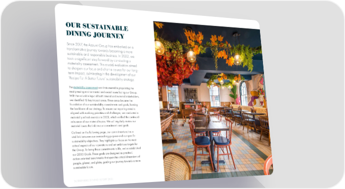 OUR SUSTAINABLE DINING JOURNEY Since 2017, the Azzurri Group has embarked on a transformative journey towards becoming a more sustainable and responsible business. In 2022, we took a signi昀椀cant step forward by conducting a materiality assessment. This crucial evaluation aimed to sharpen our focus and chart a course for our long- term impact, culminating in the development of our ‘Recipe For A Better Future’ sustainability strategy. The materiality assessment was instrumental in pinpointing the most pressing environmental and social issues facing our Group. With the valuable input of both internal and external stakeholders, we identi昀椀ed 12 key impact areas. These areas became the foundation of our sustainability commitments and goals, forming the backbone of our strategy. To ensure our reporting remains aligned with evolving priorities and challenges, we conducted a materiality refresh exercise in 2023, which veri昀椀ed the continued relevance of our material topics. We will regularly review our material issues that inform our commitments and goals. Outlined on the following page, our commitments act as a vital link between our overarching purpose and our speci昀椀c sustainability objectives. They highlight our focus on the most critical aspects of our operations and set ambitious targets for the Group. To bring these commitments to life, we’ve established our 2030 Goals. These goals are designed as practical, action-oriented benchmarks that span the critical dimensions of people, planet, and plate, guiding our journey towards a more sustainable future. SUSTAINABLE DINING REPORT 2023 8