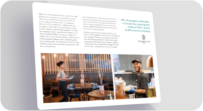 Taking care of our team members on-site is critical. Our Health Azzurri Central launched a collaboration with The Burnt Chef 66% of managers and leaders & Safety team continues to monitor and embed a culture of Project providing mental health awareness training to leaders. at Azzurri have participated safety in our restaurants. They are also responsible for the Azzurri has now offered this training to 66% of its leaders, in annual update of our ‘Fitness to Work’ online training to addition to welcoming three Mental Heath First aiders and in Burnt Chef’s mental make sure it is 昀椀t for current needs. In addition to this, since holding a wellbeing breakfast for team members focussed on health awareness training launching our 2030 Goals, our brands have been working best practice sharing amongst teams. towards improving our mental health programmes. Our teams Our brand’s investment in their people has paid off, with an have responded positively, especially to the release of a new increase in 2023 engagement scores for Azzurri, ASK Italian and ‘Mental Health and Wellness’ training via our e-learning Zizzi, compared to the previous reporting period. Our brands platform. The training has been provided as an optional course are further challenging themselves to create positive change – for those interested in deepening their understanding of the by expanding The Burnt Chef Project and setting up wellbeing topic and taking action. Team members across Azzurri Central, working groups. We are starting 2024 with bigger and bolder ASK Italian, Zizzi and Coco Di Mama have spent over 1,000 plans to support, recognise and reward our team members. hours on these modules. SUSTAINABLE DINING REPORT 2023 14