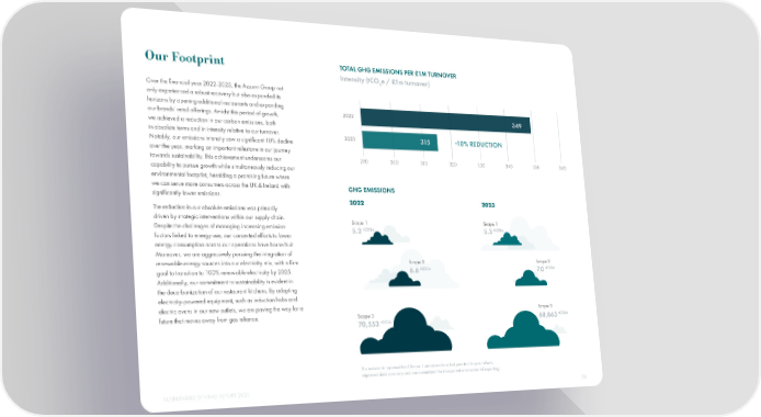Our Footprint TOTAL GHG EMISSIONS PER £1M TURNOVER Intensity (tCO e / £1m turnover) 2 Over the 昀椀nancial year 2022-2023, the Azzurri Group not only experienced a robust recovery but also expanded its horizons by opening additional restaurants and expanding our brands’ retail offerings. Amidst this period of growth, 2022 349 we achieved a reduction in our carbon emissions, both in absolute terms and in intensity relative to our turnover. 2023 315 -10% REDUCTION Notably, our emissions intensity saw a signi昀椀cant 10% decline over the year, marking an important milestone in our journey towards sustainability. This achievement underscores our 290 300 310 320 330 340 350 360 capability to pursue growth while simultaneously reducing our environmental footprint, heralding a promising future where we can serve more consumers across the UK & Ireland with GHG EMISSIONS signi昀椀cantly lower emissions. 2022 2023 The reduction in our absolute emissions was primarily driven by strategic interventions within our supply chain. Scope 1 Scope 1 Despite the challenges of managing increasing emission tCO2e tCO2e factors linked to energy use, our concerted efforts to lower 5.2 5.3 energy consumption across our operations have borne fruit. Moreover, we are aggressively pursuing the integration of renewable energy sources into our electricity mix, with a 昀椀rm Scope 2 Scope 2 tCO2e tCO2e goal to transition to 100% renewable electricity by 2025. 6.6 7.0 Additionally, our commitment to sustainability is evident in the decarbonization of our restaurant kitchens. By adopting electricity-powered equipment, such as induction hobs and electric ovens in our new outlets, we are paving the way for a Scope 3 future that moves away from gas reliance. Scope 3 tCO2e tCO2e 68,863 70,553 The revision in reported total Scope 1 emissions from last year to this year re昀氀ects improved data accuracy and our commitment to transparent environmental reporting. SUSTAINABLE DINING REPORT 2023 26