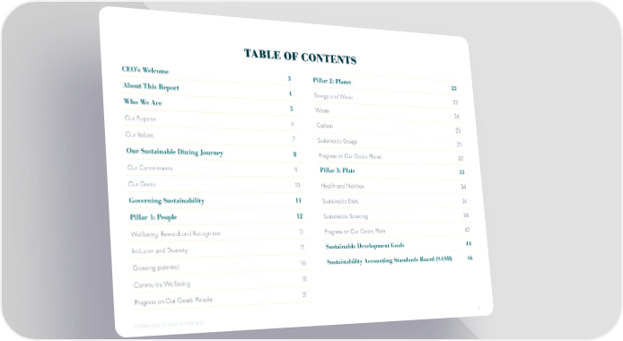 TABLE OF CONTENTS CEO’s Welcome 3 Pillar 2: Planet 22 About This Report 4 Energy and Water 23 Who We Are 5 Waste 24 Our Purpose 6 Carbon 25 Our Values 7 Sustainable Design 29 Our Sustainable Dining Journey 8 Progress on Our Goals: Planet 32 Our Commitments 9 Pillar 3: Plate 33 Our Goals 10 Health and Nutrition 34 Governing Sustainability 11 Sustainable Diets 36 Pillar 1: People 12 Sustainable Sourcing 38 Wellbeing, Reward and Recognition 13 Progress on Our Goals: Plate 42 Inclusion and Diversity 15 Sustainable Development Goals 44 Growing potential 16 Sustainability Accounting Standards Board (SASB) 46 Community Wellbeing 18 Progress on Our Goals: People 21 SUSTAINABLE DINING REPORT 2023 2
